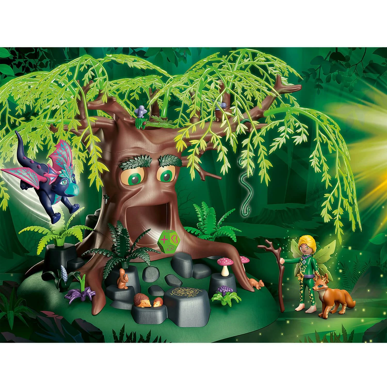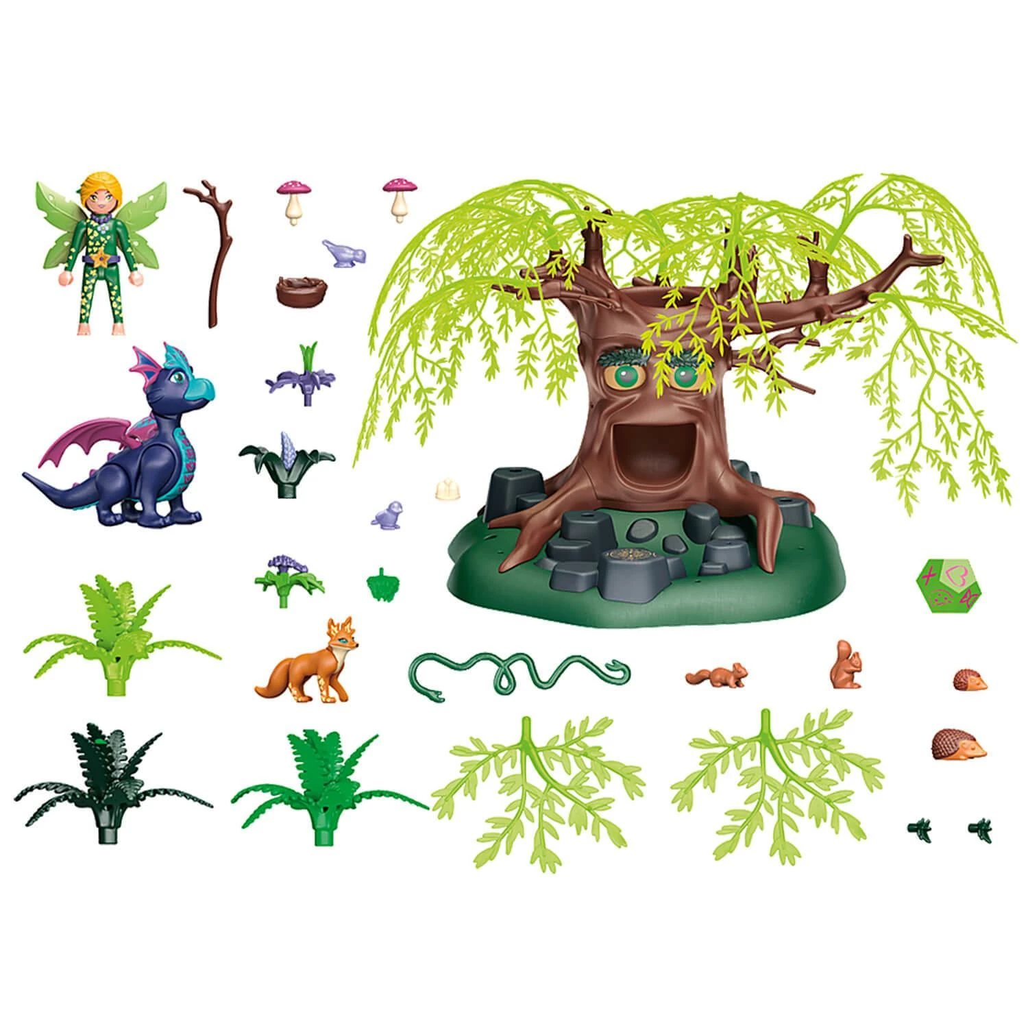 L’ensemble de jeu comprend : une fĂ©e de la forĂŞt avec un animal totem renard, un arbre de la sagesse avec des paupières mobiles, une cachette secrète et un cube magique, un petit dragon et de nombreuses autres choses amusantes. Les feuilles de l’arbre brillent dans le noir.