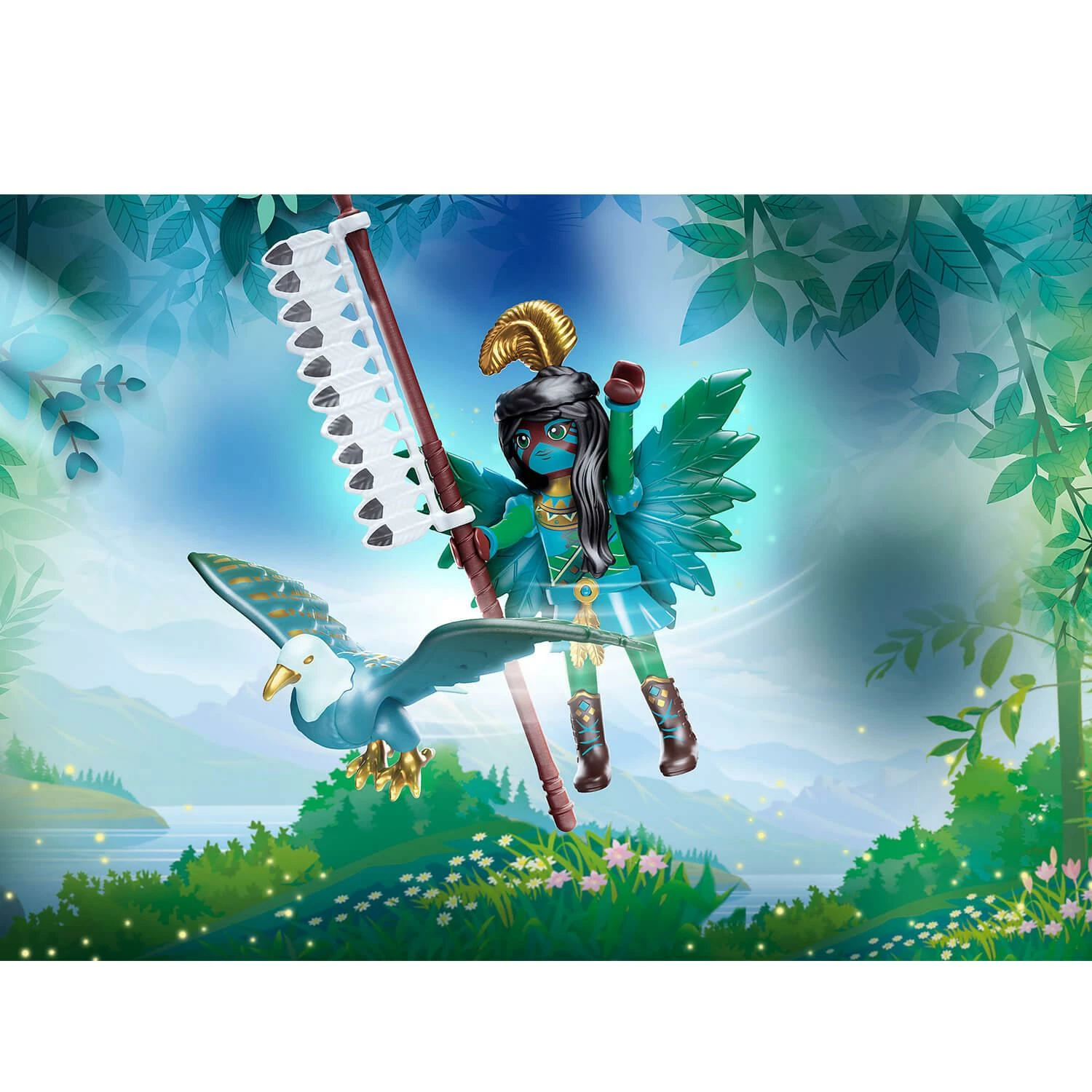 Ce set de jeu Playmobil comprend : une fée chevalier avec un animal totem aigle, une lance en plumes et d’autres extras. La jupe et l’accessoire pour cheveux peuvent être retirés.