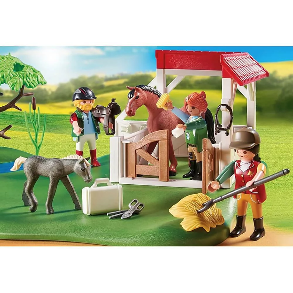 Contenu : Avec 6 personnages (des cavaliers, un vĂ©tĂ©rinaire et un bucheron), un cheval et deux poulains et des accessoires (une fourche, de la nourriture pour les chevauxâŠ)