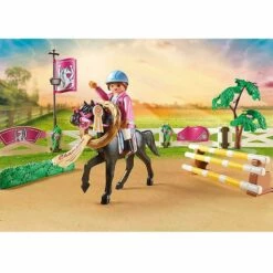 C’est parti pour la compĂ©tition, le parcours est prĂȘt pour les cavaliers. Trop beaux les chevaux : les brides sont assorties aux vĂȘtements des cavaliĂšres ! Qui sera la gagnante ? Le podium et le trophĂ©e sont dĂ©jĂ prĂȘts pour la cĂ©rĂ©monie. Les obstacles peuvent ĂȘtre modulĂ©s entre eux. Les cavaliers et les brides des chevaux sont assortis.Â