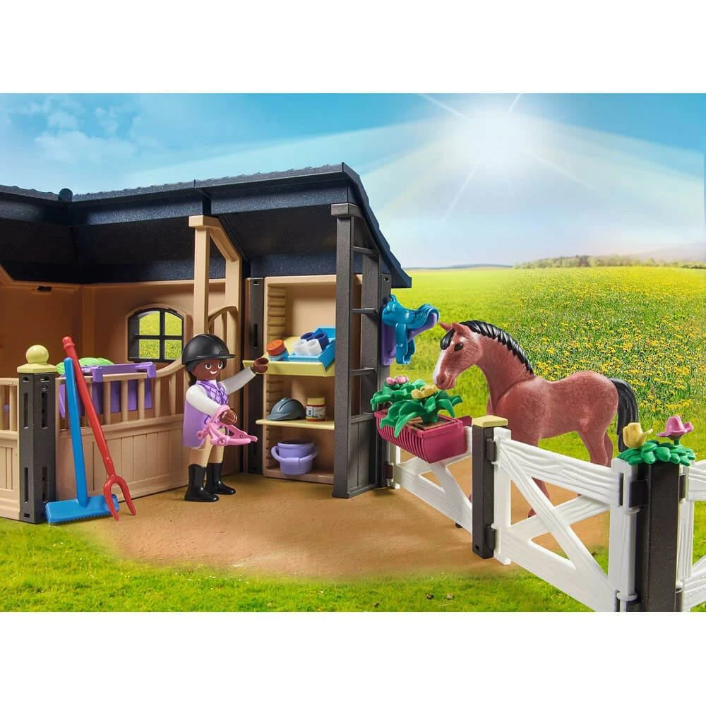 La jument Playmobil et son poulain coulent des jours heureux dans leur étable, soignés par les cavaliers. Fournis avec tous les accessoires nécessaires à l’entretien de leur crinière ainsi que de leurs sabots, ce set de jeux comprend également une carrière, idéale pour que les chevaux entretiennent leur santé.
