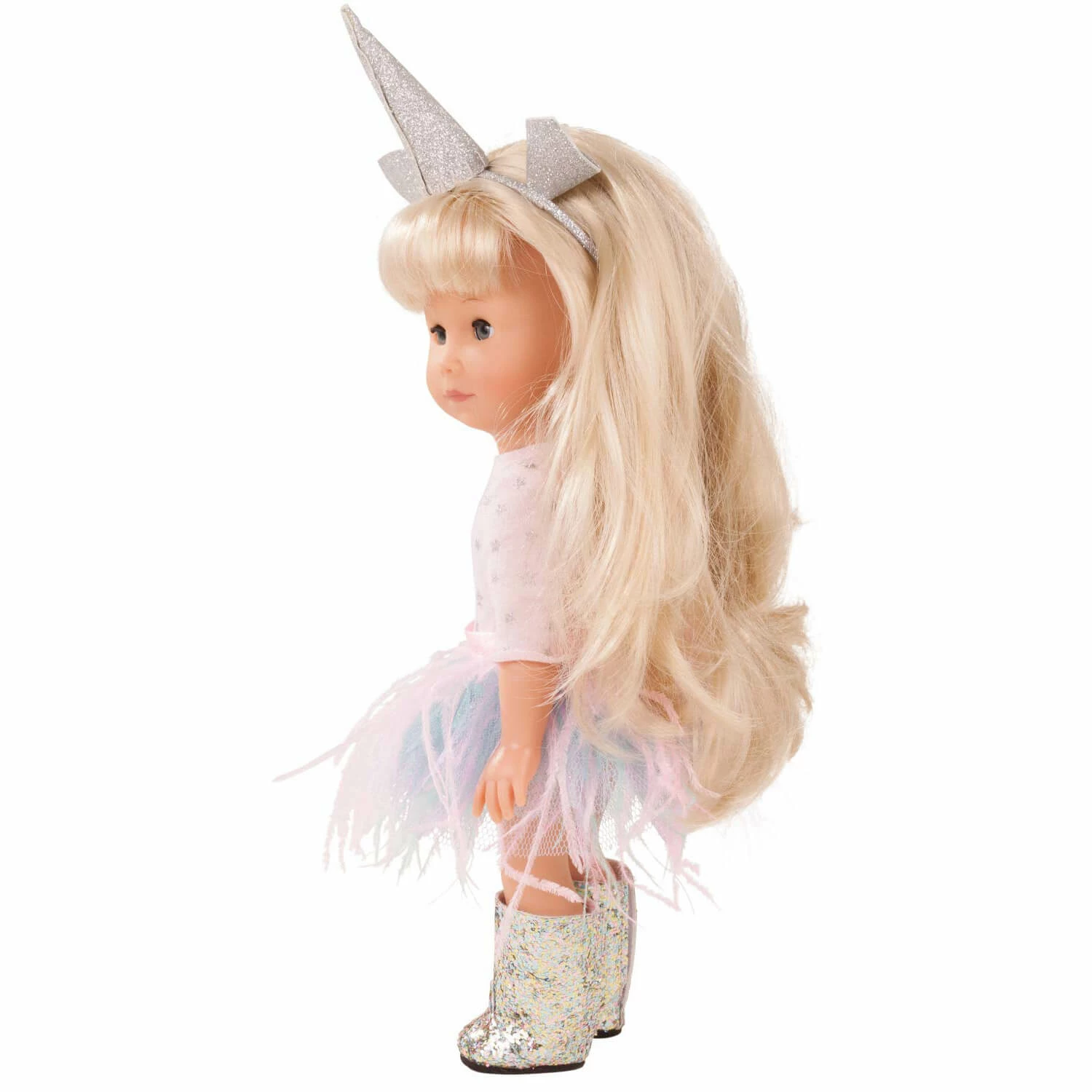 Mia, votre poupĂ©e aux cheveux longs blonds et aux yeux bleus, est vĂȘtue d’un tee-shirt rose parsemĂ© d’Ă©toiles grises et d’une jupe rose et bleue. Elle porte des bottes argentĂ©es qui scintillent et un serre-tĂȘte avec une corne de licorne argentĂ©e qui brille Ă©galement.