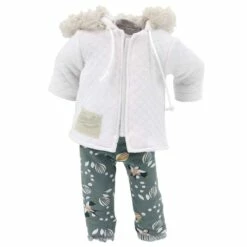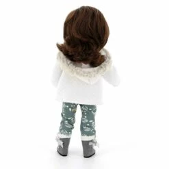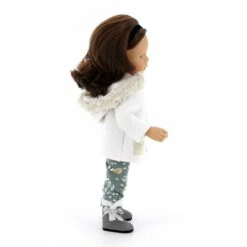 Anaëlle porte un beau manteau blanc avec un col en fausse fourrure et un pantalon souple de couleur kaki avec un motif d’oiseau. En dessous de son manteau, Anaëlle porte un tee-shirt gris avec un nounours brodé. Pour avoir bien chaud l’hiver, la tenue est complétée par des belles bottes grises et un bandeau à paillettes dans ses cheveux. Le manteau s’ouvre et se ferme facilement à l’aide de velcro blanc. Cette fermeture permet aux enfants de manipuler et jouer facilement avec leur poupée.