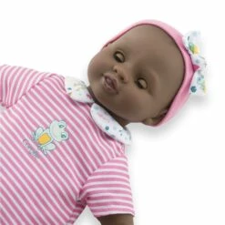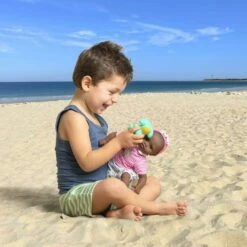 Ce compagnon est idéal pour les jeux d’eaux. Son corps souple lui permet de prendre les mêmes positions qu’un vrai bébé. Son visage, ses bras et ses jambes, à la délicate senteur de vanille, sont en vinyle doux au toucher. Avec ses yeux dormeurs, il fait dodo quand on le couche sur le dos.