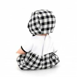 Maé porte une belle combinaison en vichy noir et blanc avec son bonnet assorti. Les vêtements sont lavables en machine dès 30° dans un petit pochon en tissu. Cette combinaison se ferme grâce à du velcro pour faciliter l’habillage et le déshabillage de la poupée.