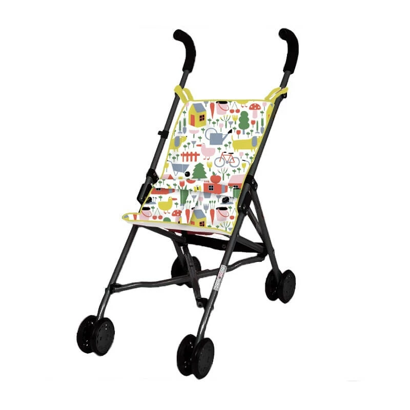 La poussette pour poupĂ©e La campagne est superbe pour pouvoir partir en balade avec sa poupĂ©e. DĂ©corĂ©e de plusieurs motifs reprĂ©sentant la campagne avec des animaux tels qu’un chien ou un canard, ou encore des petites fleurs et de jolies maisons. On installe sa poupĂ©e dans la poussette, une jambe de chaque cĂŽtĂ© de la ceinture, on l’attache et hop, C’est partie pour une promenade !