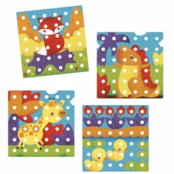 Jumbo Peggy contient 36 clous de grande taille et 9 plaques Ă encastrer en bioplastique. Les plaques et les clous se transforment en un jeu de construction original.
