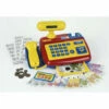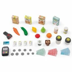 De nombreux accessoires sont inclus pour agrémenter les fonctions de jeu : 4 boites factices, 6 fruits et légumes, 2 pots de yaourt, 2 canettes, 2 bocaux, 1 lecteur de code-barres électronique avec son et lumiÚre, 1 carte bancaire, 4 tickets de caisse, 9 piÚces, 12 billets, et 1 panier.