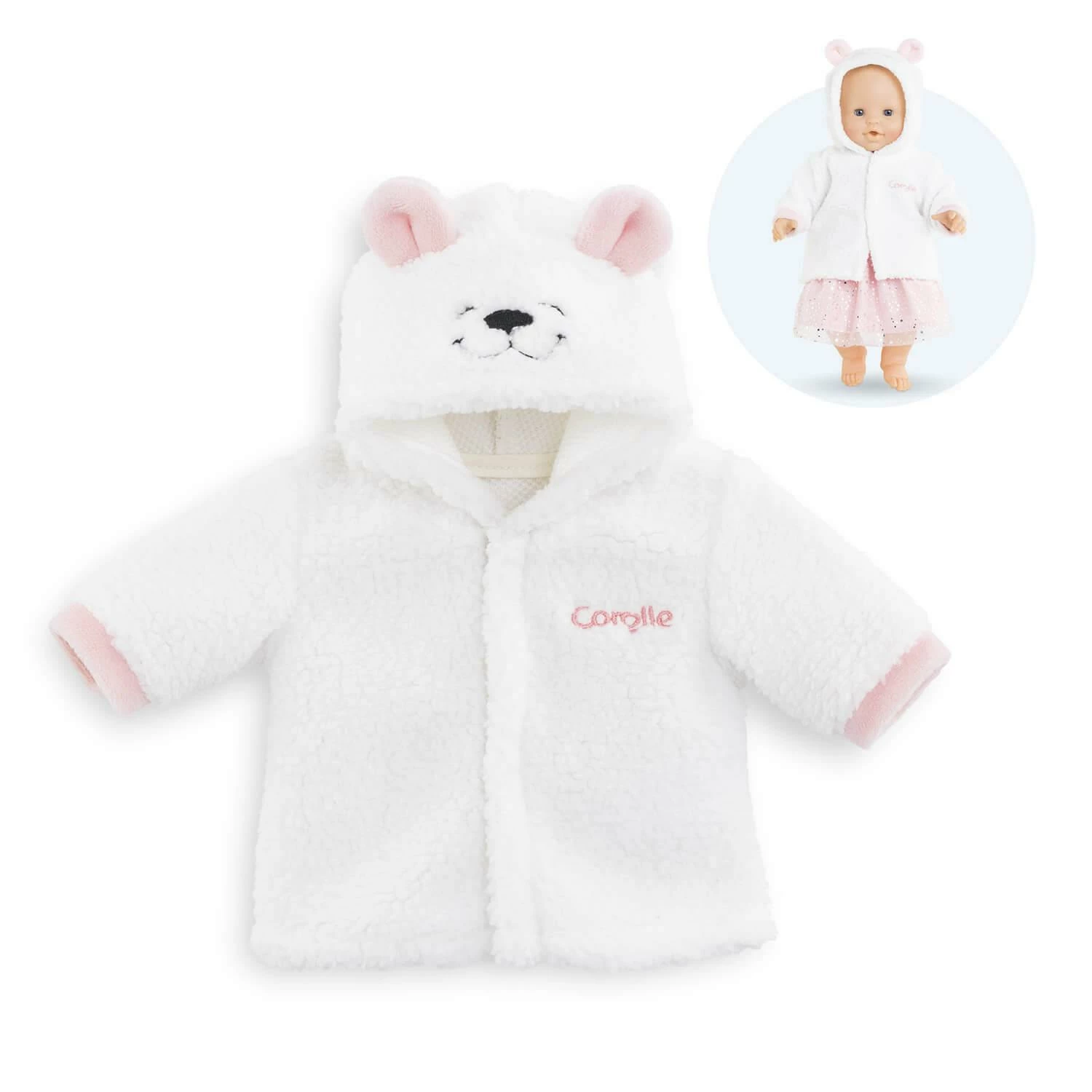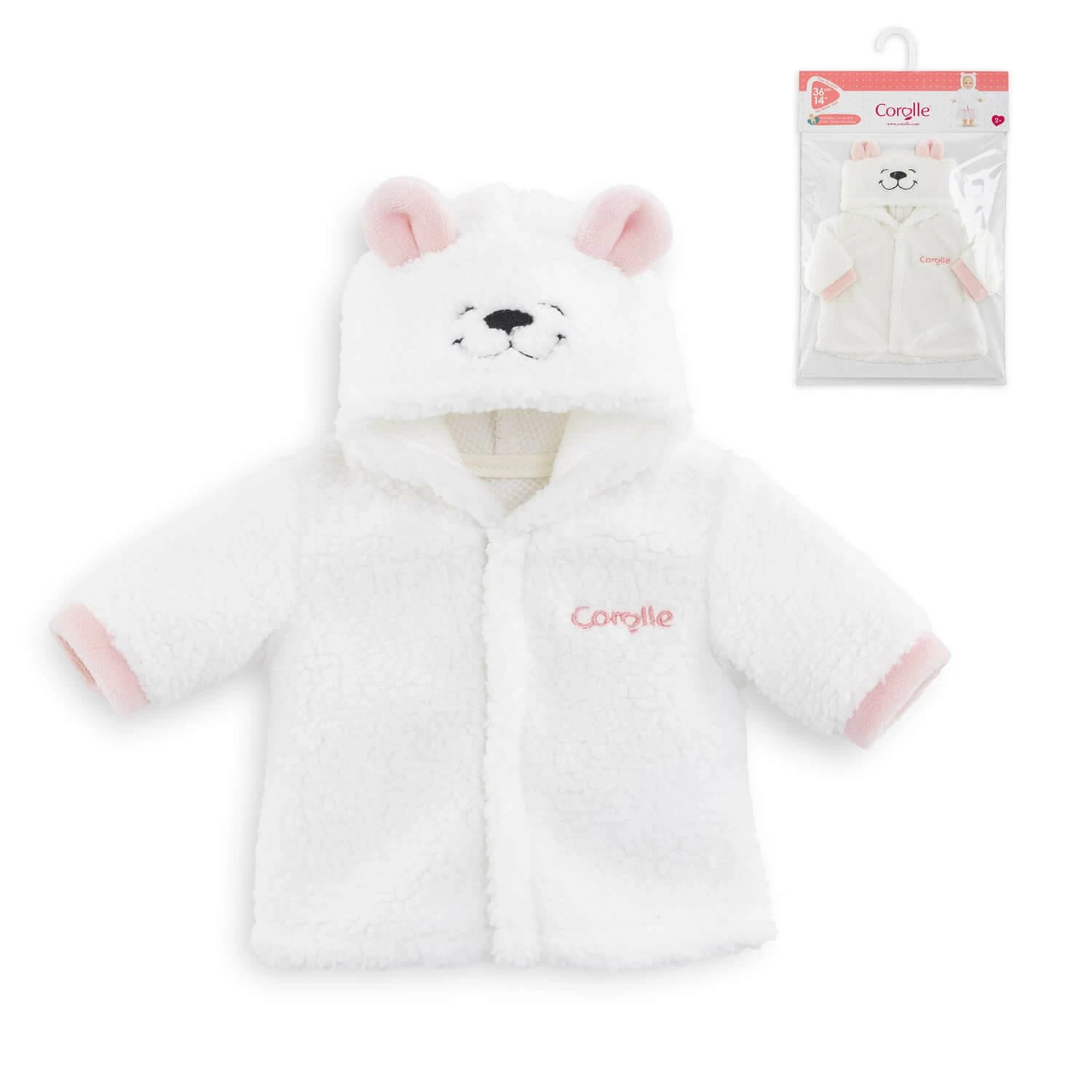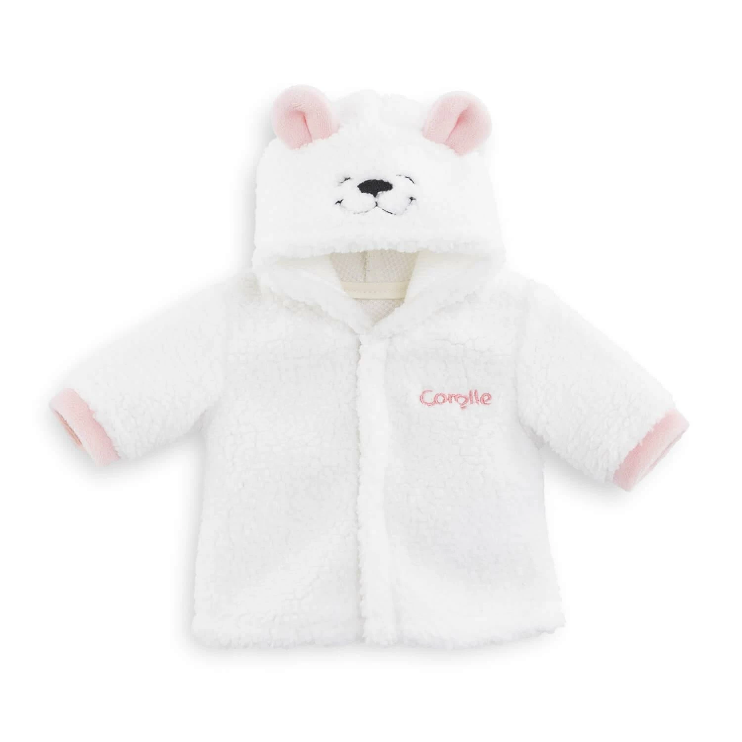 Le manteau rose en fourrure toute douce est muni d’une amusante capuche à tête d’ourson avec de petites oreilles grises.